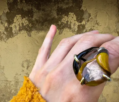 The Amber ring, crafted with traditional jewelry techniques meeting silver, is part of the Biota Collection, where glass takes a wearable form in a way that carries patterns of living beings.