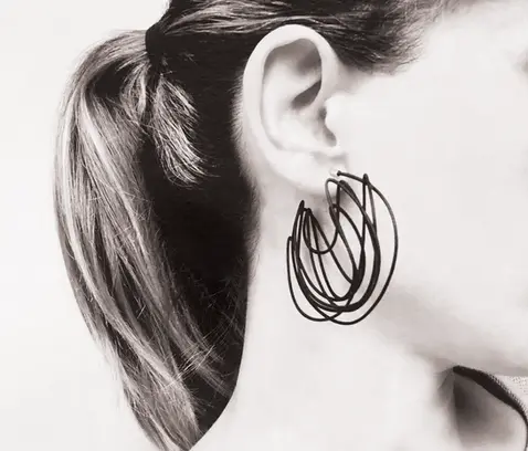 The sketch earrings were designed digitally and produced using 3D printing technology. Earring post is made of 925 sterling silver. Offering different perspectives from various angles, the design is lightweight and functional.